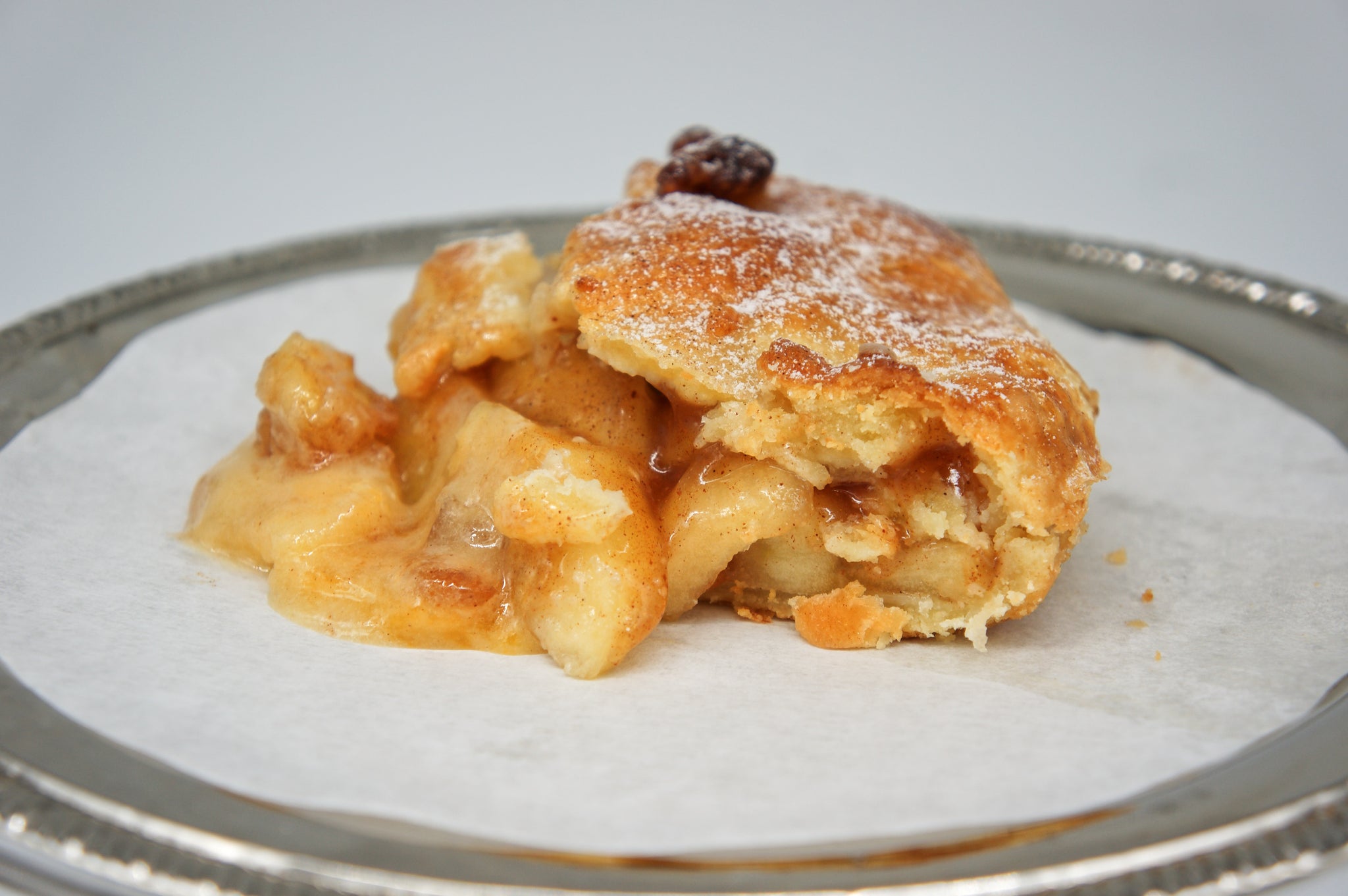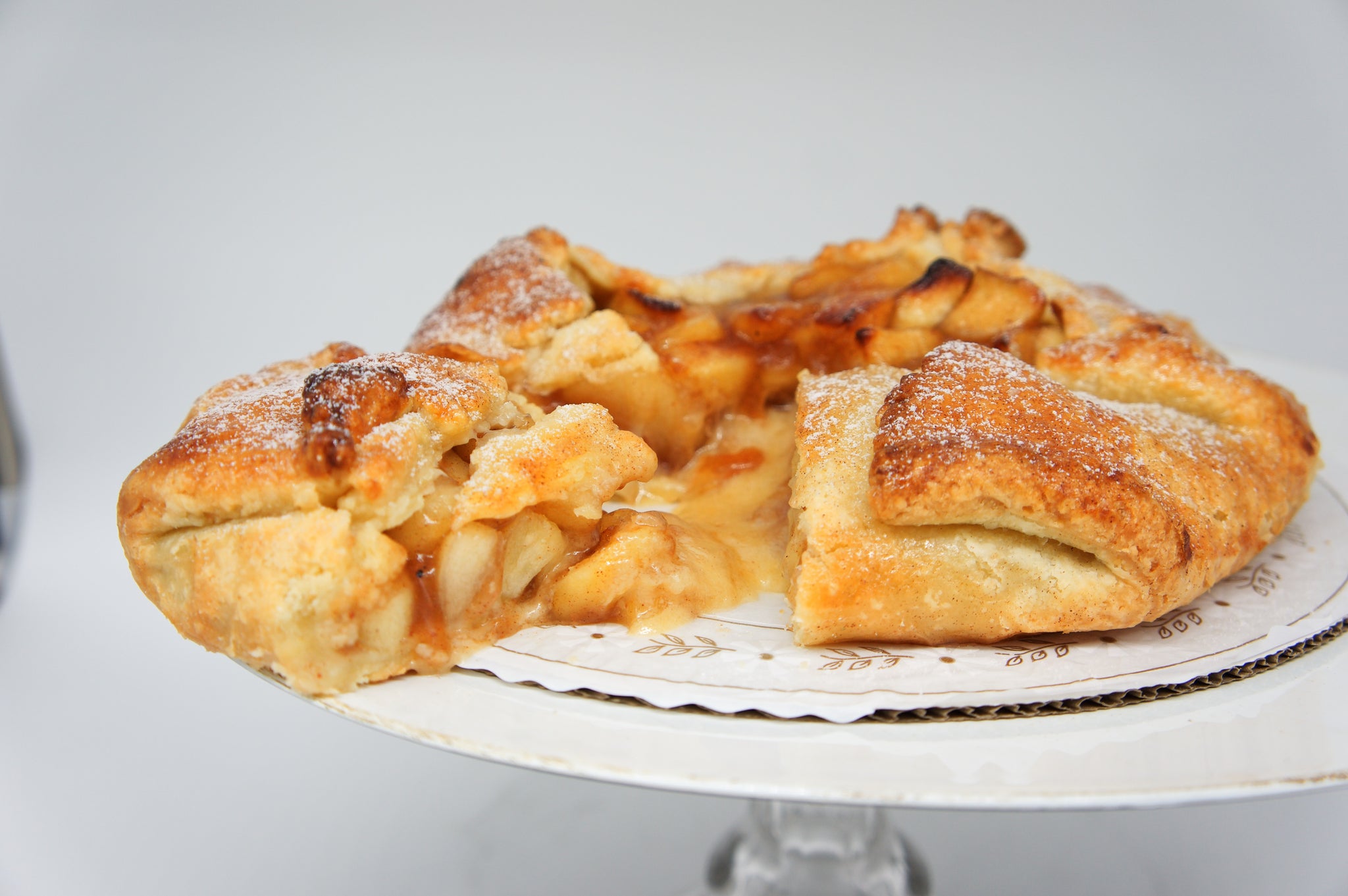 French apple full-sized tart with cinnamon apples, an almond paste and apricot jam with a flakey buttery crust.